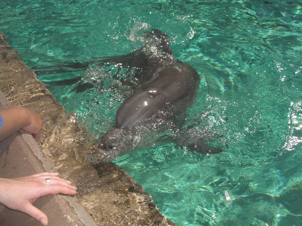 Zu den Delphinen konnte manganz hin und sie sogar füttern... Links sieht man Rominas Hand, sie hat sich allerdings nicht ganz