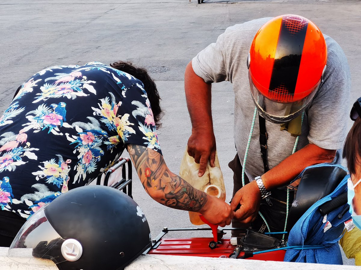 der letzte Benzin eines Rally Kollegen wird vertankt - der darf im Kanister nicht mit auf die Fähre